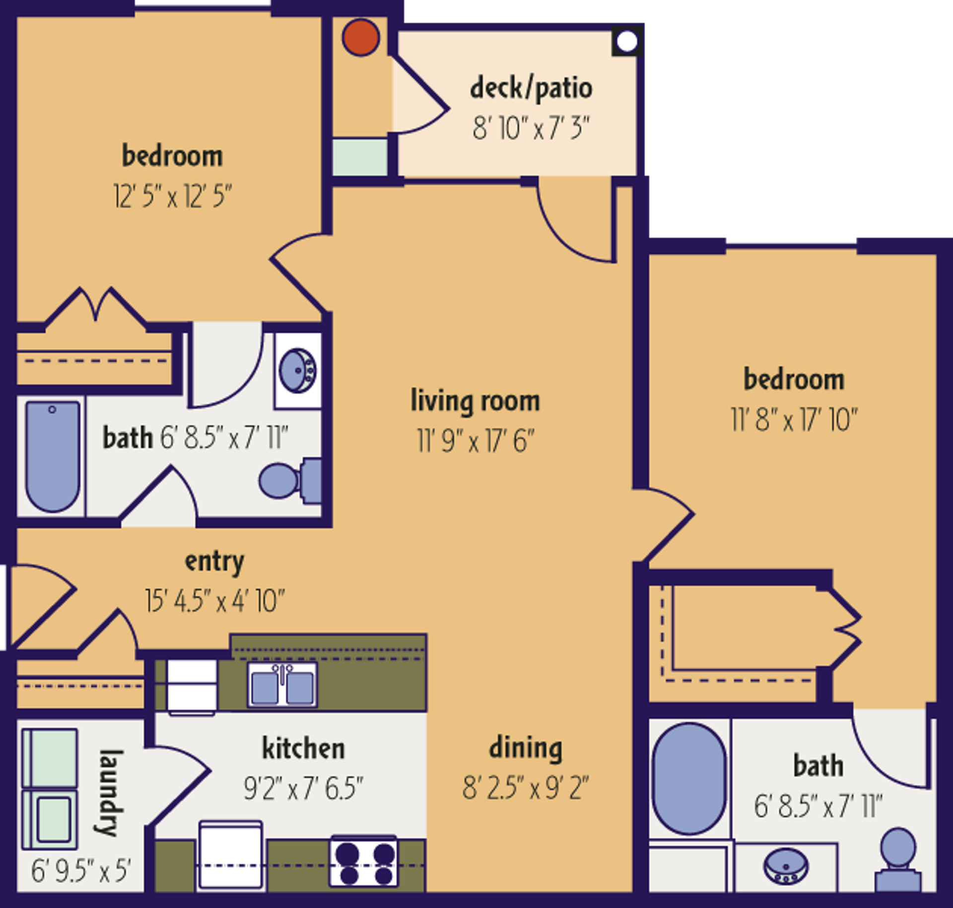 The Berkeley's 1,112 sqft. 2 bedroom and 2 bathroom apartment located on the 1st floor features stainless steel appliances, granite countertops, an outdoor storage closet, spacious living space, walk-in master closet, and luxury finishes.