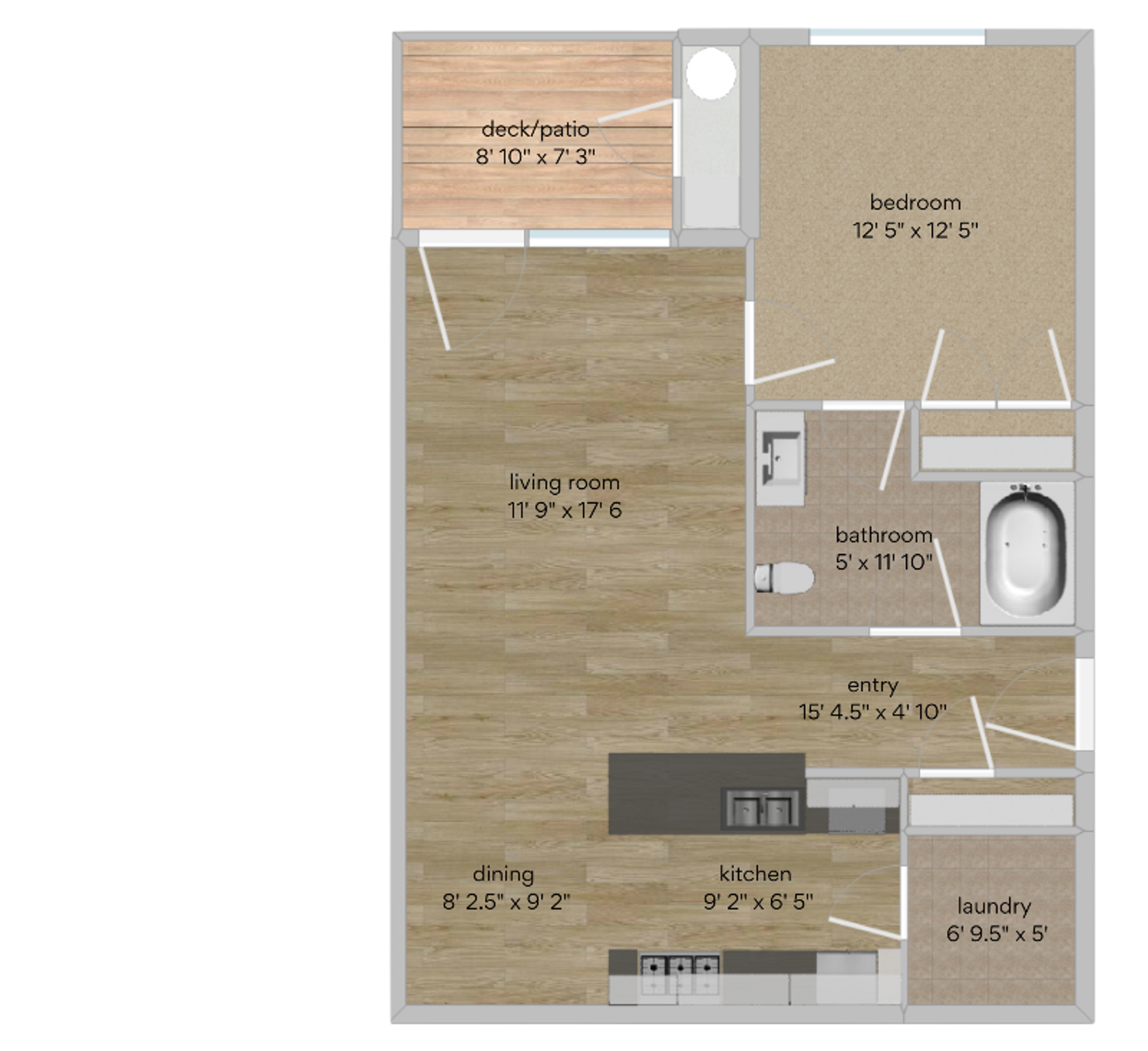 The Berkeley's 802 sqft. 1 bedroom and 1 bathroom apartment located on the 3rd floor features stainless steel appliances, granite countertops, an outdoor storage closet, spacious living space, and luxury finishes.